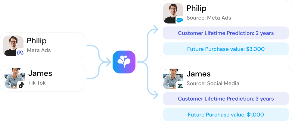 Elai predice la durata futura del rapporto con ciascun cliente e il Customer Lifetime Value futuro (CLV) di ogni cliente.