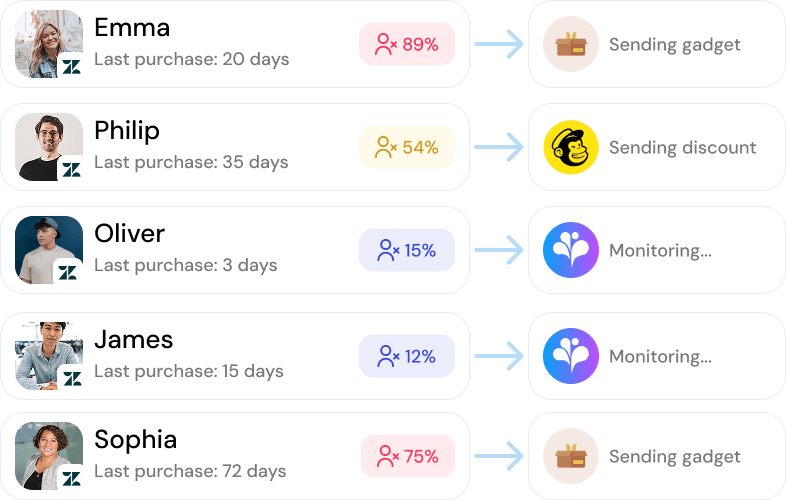 Grazie alla predizione del churn puoi monitorare l’evoluzione del rischio di abbandono nel tempo di ogni cliente e attivare dei customer journey progettati per prevenirlo.